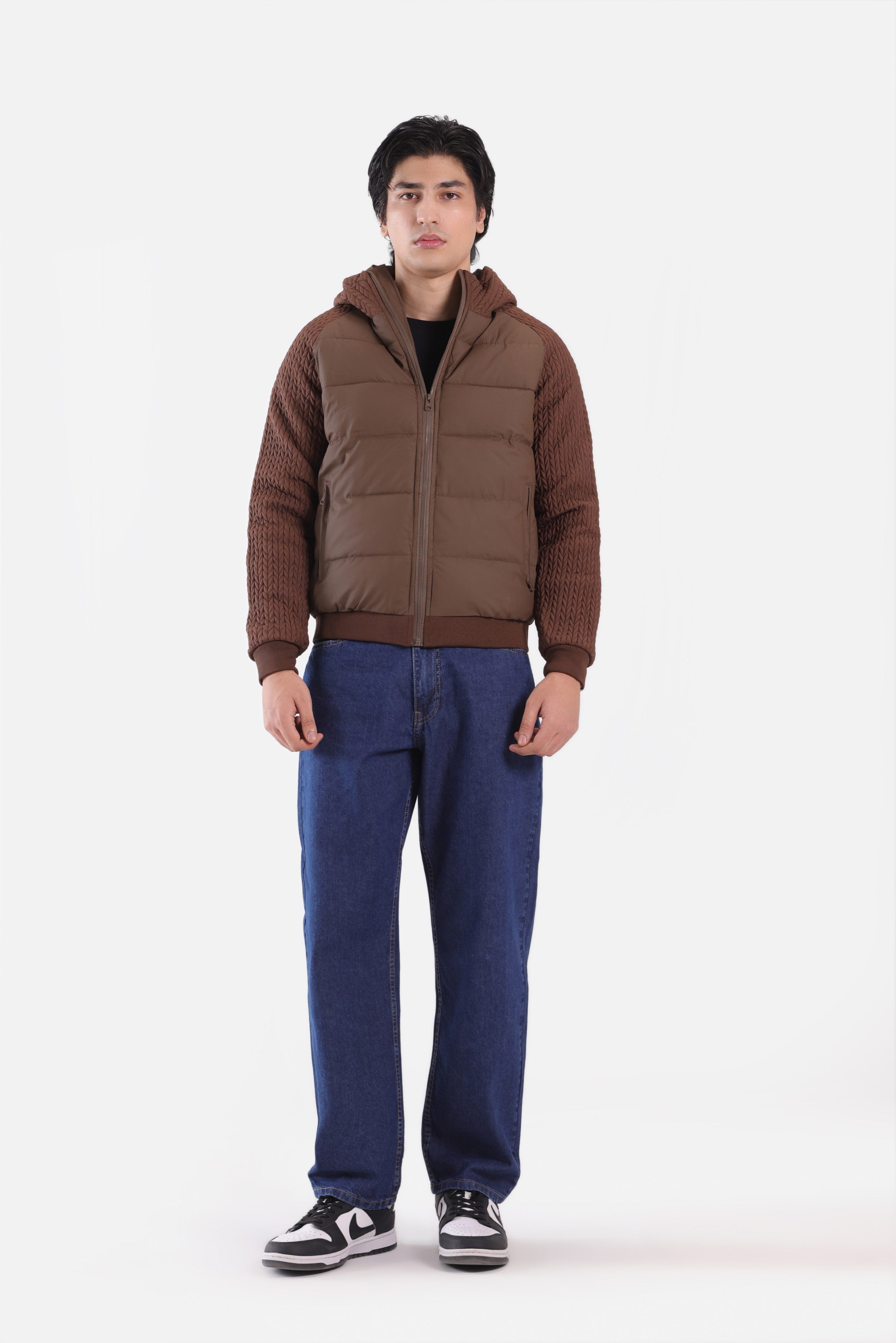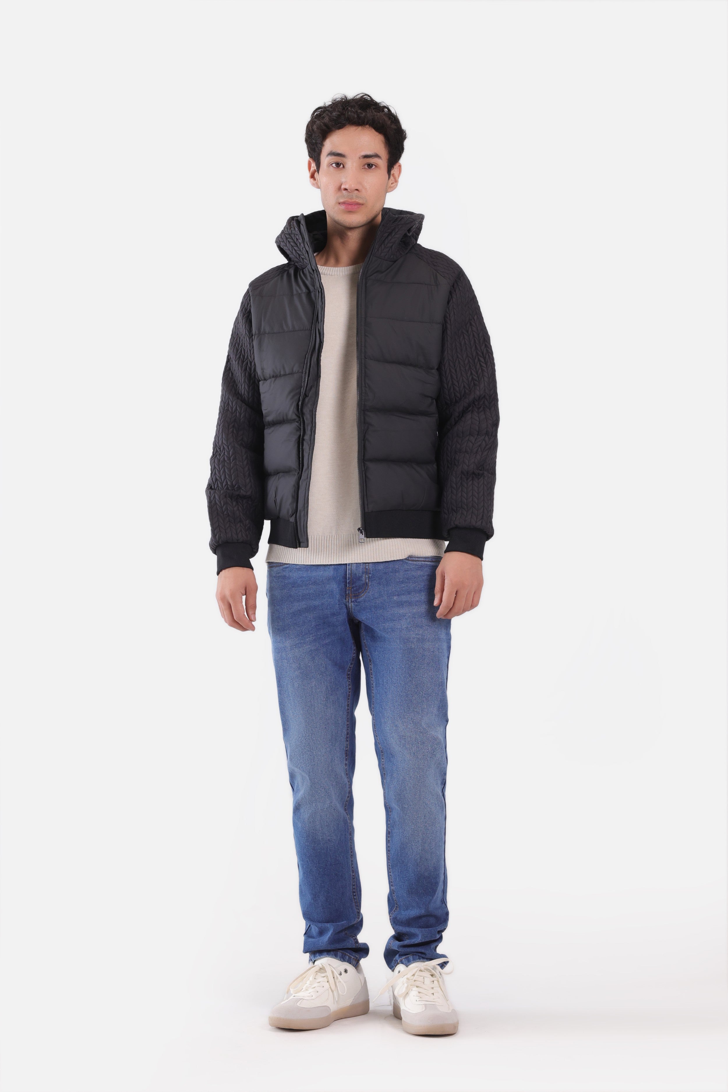 - Style: Puffer Jacket with Knit Sleeves
